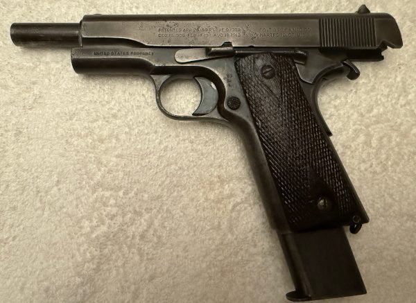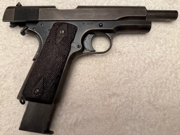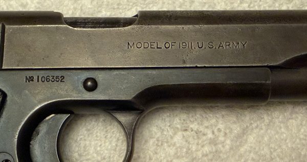 Featuring a 5-inch barrel, steel frame, grip safety, thumb safety, and single-stack magazine design, the U.S. Army-marked 1911 became the standard U.S. service pistol through World War I, World War II (as the later M1911A1 variant), and beyond. Early examples are marked “U.S. Army” on the frame and were manufactured primarily by Colt, along with other wartime contractors in later years.