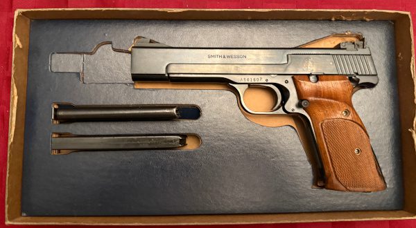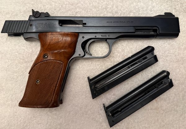 The Smith & Wesson Model 41 is a precision‑oriented, single‑action .22 Long Rifle target pistol revered for its exceptional accuracy and craftsmanship. Built on a robust steel frame with finely machined components, the Model 41 was designed with competitive shooters in mind, offering a crisp, light trigger pull and outstanding barrel harmonics that contribute to tight groupings at distance. Its adjustable sights and well‑balanced ergonomics promote consistent, repeatable performance, making it a favorite in bullseye and other precision pistol disciplines. Known for smooth operation and enduring quality, the Model 41 remains one of Smith & Wesson’s most respected .22 caliber sporting pistols.