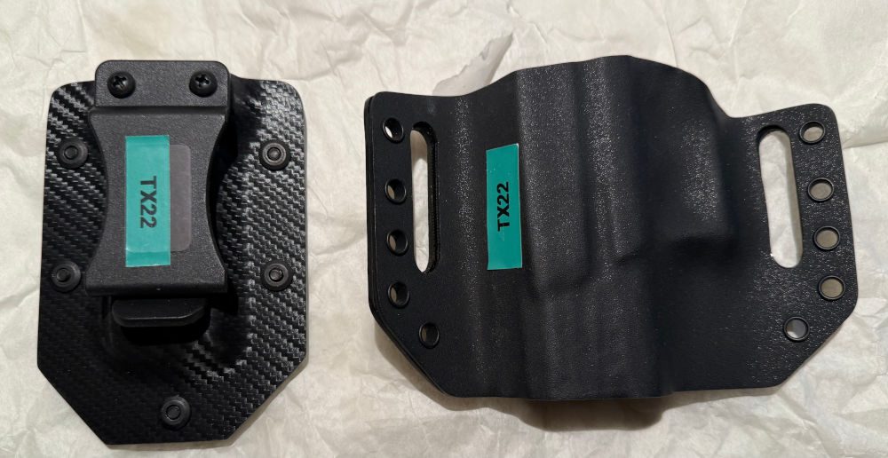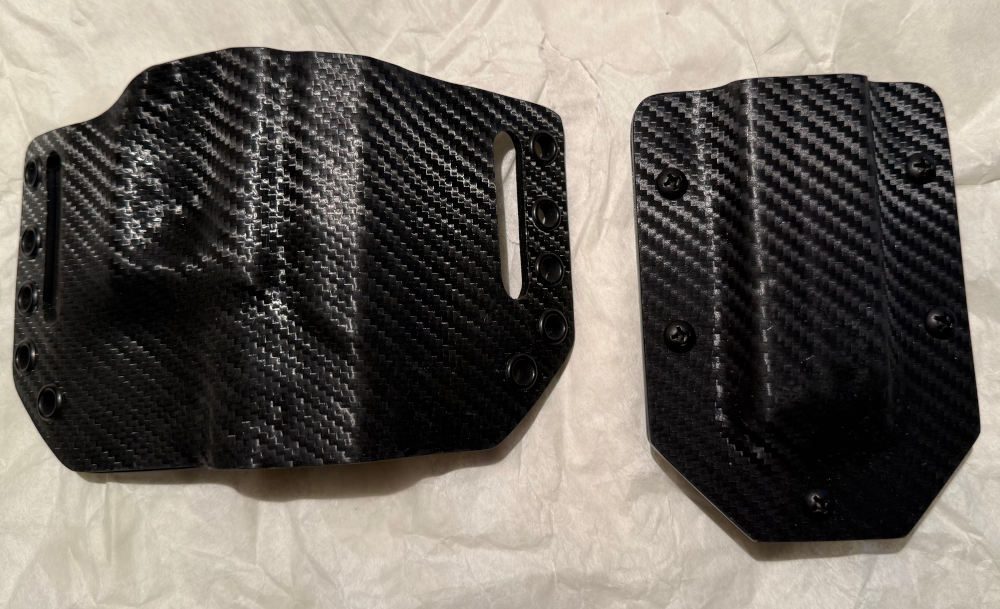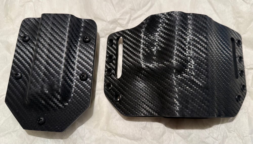 This duo is the carbon fiber holster for the Taurus 22 and also a spare magazine carrier. Both pieces are worn on a belt. Great condition, looks like new and never used.